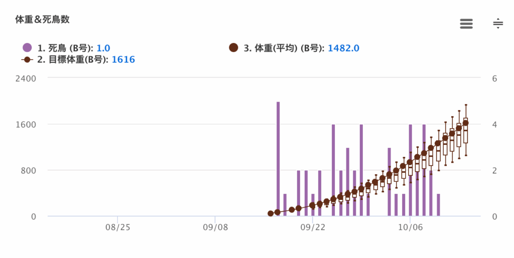 また、死鳥数もグラフで確認しています。死鳥数が多いと、やはり生きているブロイラー体重の伸びも悪い傾向にありますね。1日に10匹死んでいる日が数日続いた場合は、これから病気になる可能性が高いと判断し、早めに対処をします。