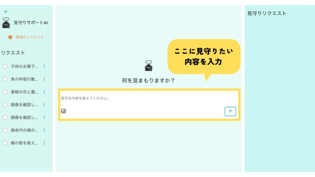 ①アクト・アップから、見守りサポートAIを開きます。「見守る内容を教えてください。」の箇所に、何をどのように見守りたいかをチャットで記入します。