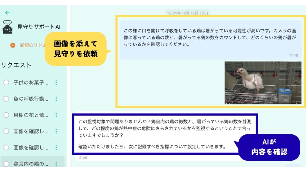 「鶏を見守ってください」と指示をしただけでは、AIが何をすれば良いのか理解できず見守りの精度が低くなります。たとえば「口を開けて呼吸をしている鶏は暑がっている可能性があります。画面の中に暑がっている鶏が何匹いるか計測してください」と、発見したい鶏の状態を具体的に定義してあげてから指示をすると、AIの見守り精度が高まります。画像を添付して解説するのも有効です。