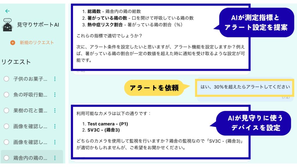 ④設定が完了すると、AIがカメラ画像などを常時解析し、状態の記録や異常時のアラート通知を自動で行ってくれます。